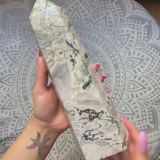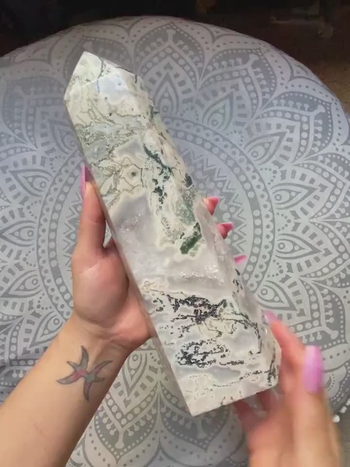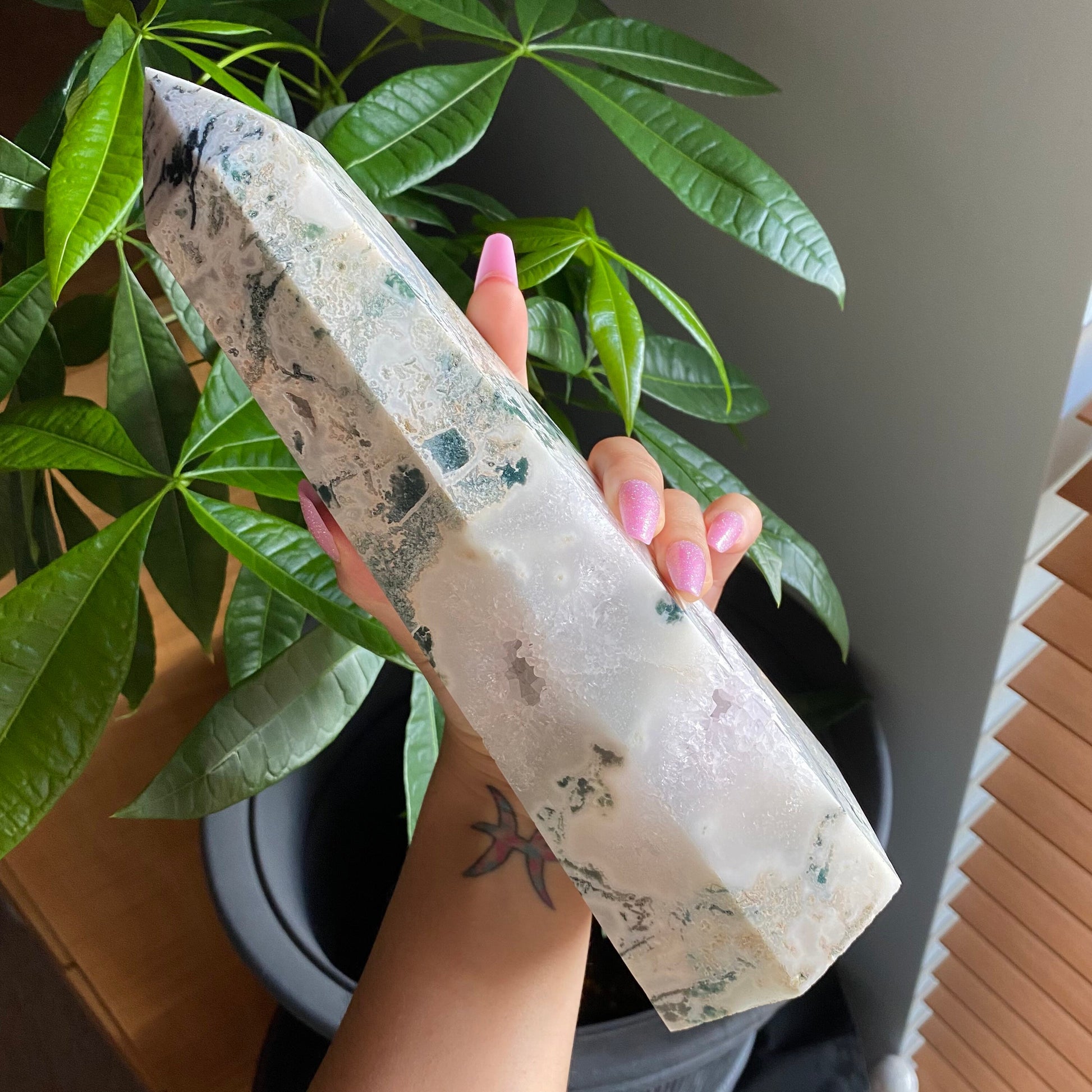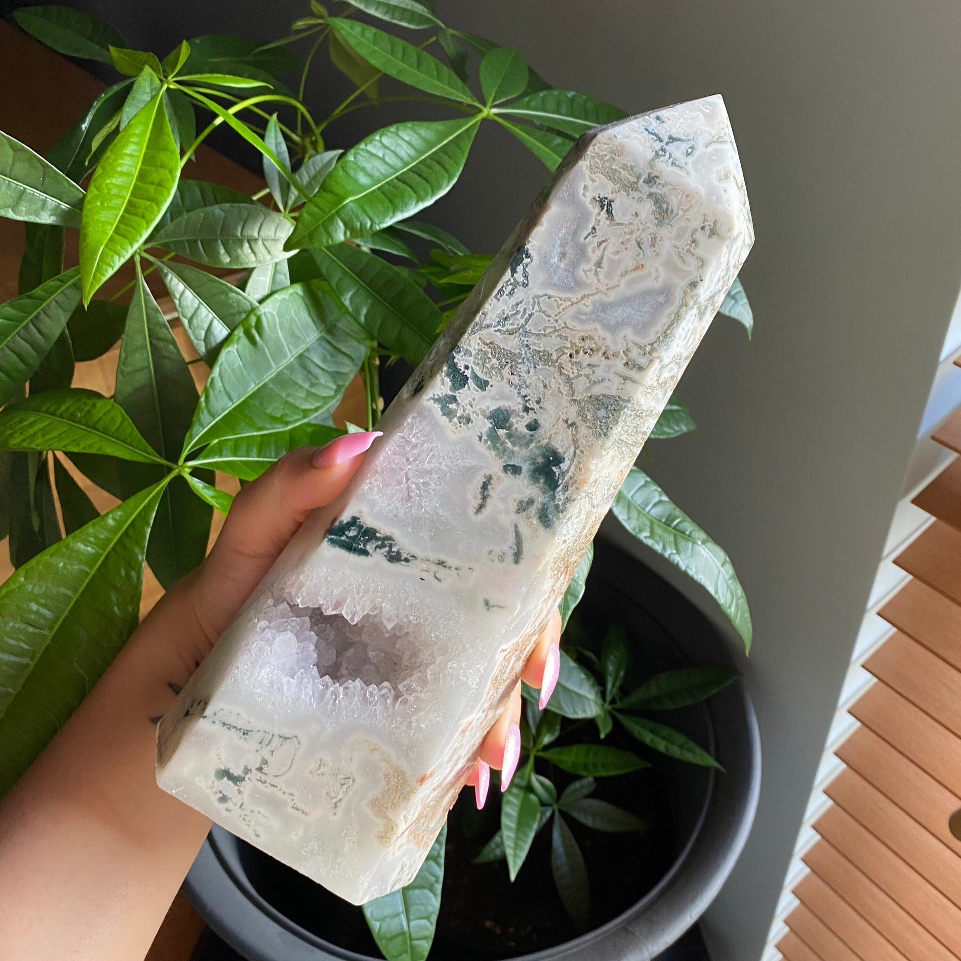 This listing is for one (1) Moss Agate w/ Druzy Tower. You will receive the crystal pictured.