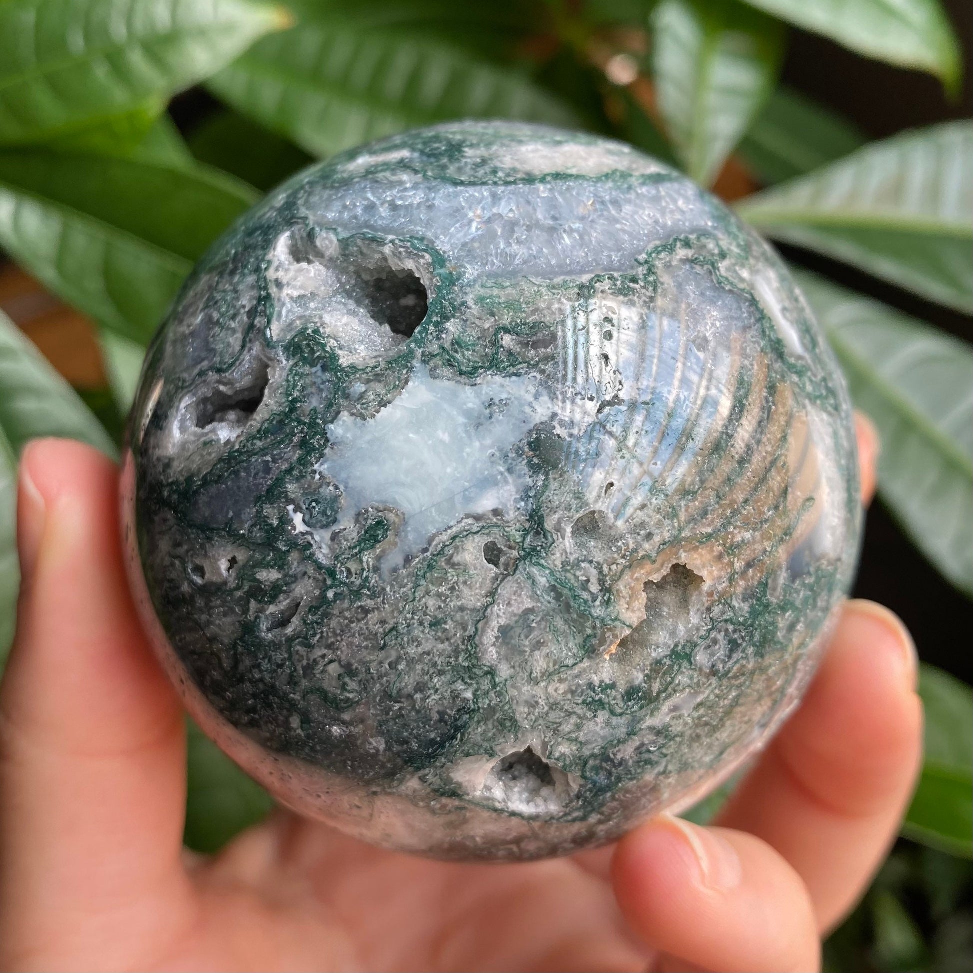 Moss Agate Sphere w/ Druzy | 15.2 oz | 2.7 in | Crystal Sphere | Quartz Inclusions | Crystal Rainbows